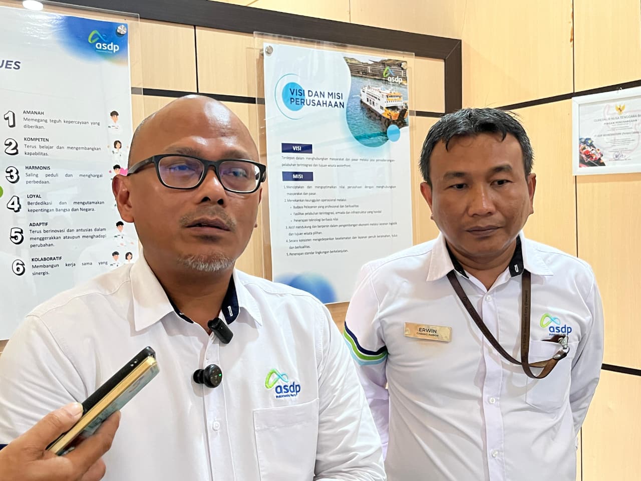 General Manager PT ASDP Indonesia Ferry (Persero) Cabang Lembar, Handoyo Priyanto (kiri), didampingi Manager Usaha PT ASDP Cabang Lembar, Erwin Baharuddin, saat memberikan keterangan terkait kesiapan penyeberangan jelang Tahun Baru 2026. (Foto: Istimewa)
