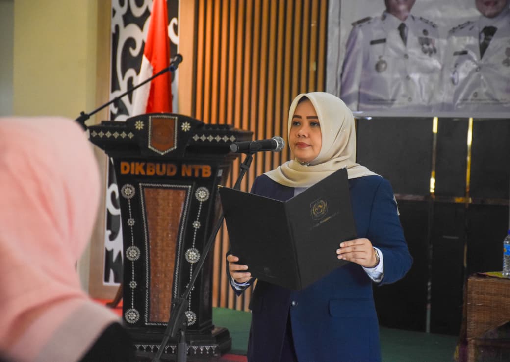 Wagub NTB Hj. Indah Dhamayanti Putri memimpin pengambilan sumpah jabatan Kepala SMA/SMK Negeri se-NTB di Kantor Dikpora NTB, Senin (26/1/2026). (Dok. Diskominfotik NTB)